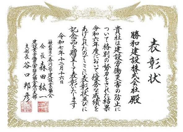 建設労働安全表彰式において一般社団法人香川県建設業協会長様ならびに建設労働災害防止協会香川支部長様より優秀会員表彰を頂きました。